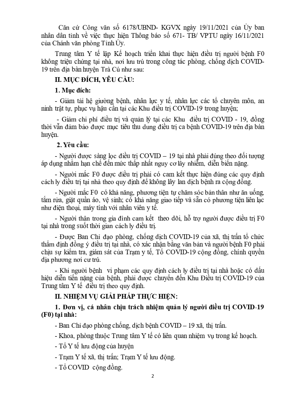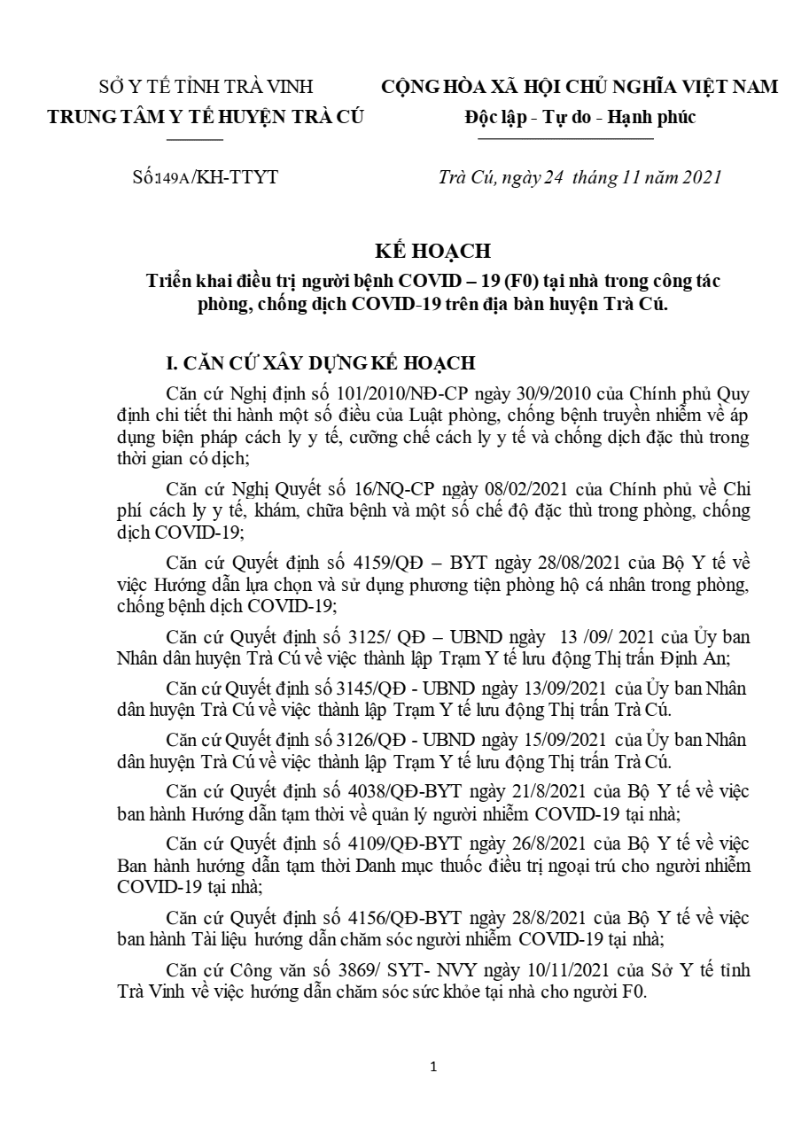 Kế Hoạch Triển Khai Điều Trị Người Bệnh COVID – 19 (F0) Tại Nhà Ngày đăng: 24/11/2021 - 09:10 Chia sẻ: | In bài viết