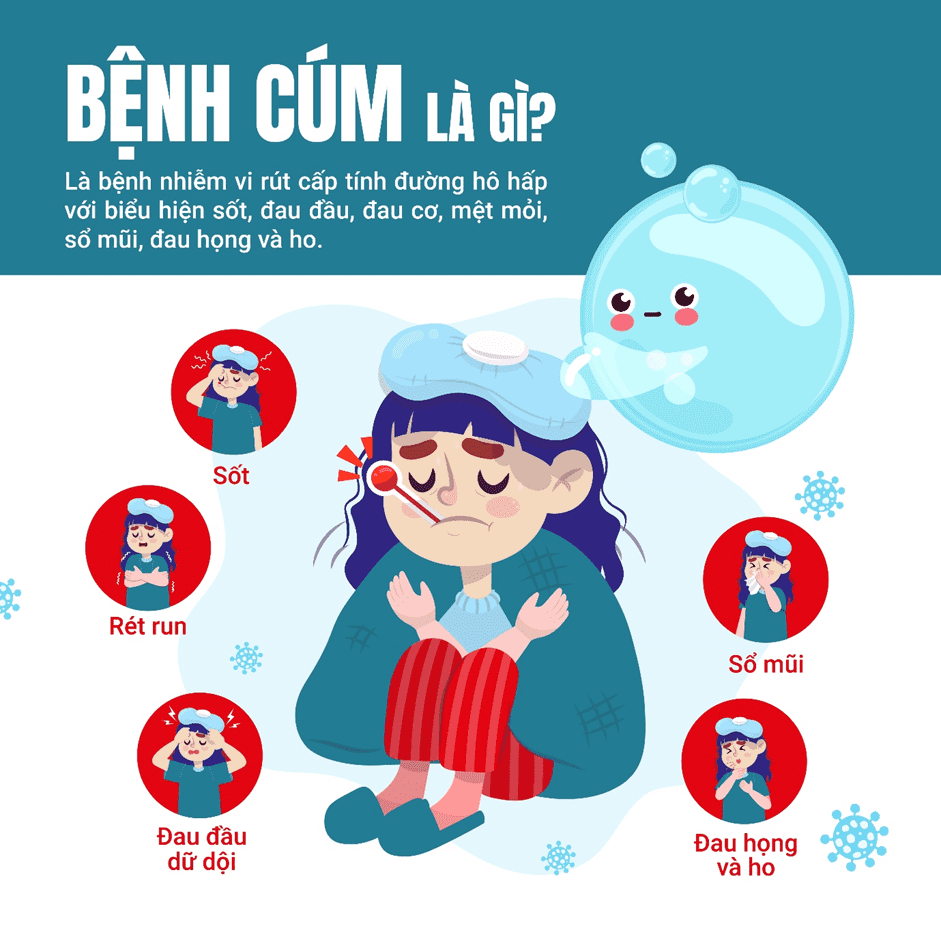 - Là bệnh nhiễm vi rút cấp tính đường hô hấp do các vi rút cúm A được chia thành 3 týp A, B và C với biểu hiện sốt, đau đầu, đau cơ, mệt mỏi, sổ mũi, đau họng và ho. Ho thường nặng và kéo dài. Có thể kèm theo các triệu chứng đường tiêu hóa (buồn nôn, nôn, ỉa chảy), đặc biệt ở trẻ em. Thông thường bệnh diễn biến nhẹ và hồi phục trong vòng 2-7 ngày.
