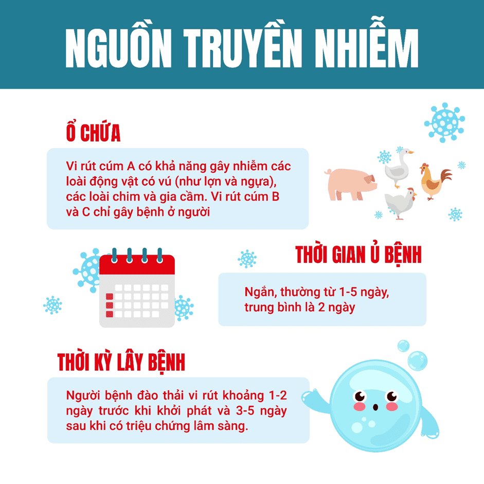 3. Phương thức lây truyền: Bệnh cúm là bệnh có khả năng lây nhiễm rất cao và lây truyền nhanh. Bệnh lây lan qua đường hô hấp, qua không khí giọt nhỏ qua các giọt nhỏ nước bọt hay dịch tiết mũi họng của bệnh nhân có chứa vi rút cúm qua ho, hắt hơi. Vi rút vào cơ thể qua đường mũi họng. Tỷ lệ lây lan càng mạnh khi tiếp xúc trực tiếp, đặc biệt ở nơi tập trung đông người như trường học, nhà trẻ. Trong điều kiện thời tiết lạnh và ẩm thấp, mức độ lây lan càng nhanh hơn.