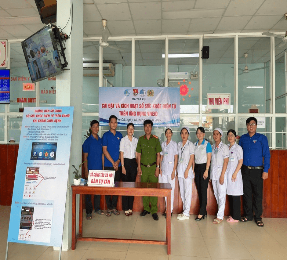 Sáng ngày 18/8/2025, Đoàn Thanh niên và Tổ Công tác xã hội thuộc Trung tâm Y tế khu vực Trà Cú phối hợp cùng Xã đoàn, Hội Liên hiệp Phụ nữ và Công an xã Trà Cú tổ chức ra quân thực hiện đợt cao điểm “Triển khai vận động, hỗ trợ người dân cài đặt và kích hoạt Sổ sức khoẻ điện tử trên ứng dụng VNeID”.