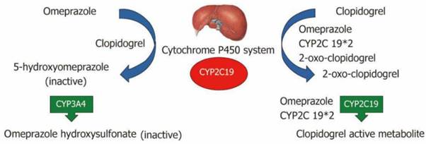 Tuy nhiên, khi sử dụng phối hợp để kiểm soát các tác dụng phụ, nguy cơ liên quan đến việc sử dụng clopidogrel và PPI do tương tác thuốc cũng xuất hiện. Clopidogrel là một tiền chất được hoạt hóa bởi enzyme CYP2C19. Omeprazole và esomeprazole là chất ức chế enzyme này, nghĩa là việc sử dụng đồng thời có thể làm giảm nồng độ clopidogrel đã hoạt hóa trong huyết tương. Các PPI khác có thể ức chế CYP2C19 ở mức độ thấp hơn và tương tác thuốc chưa có ý nghĩa trên lâm sàng.