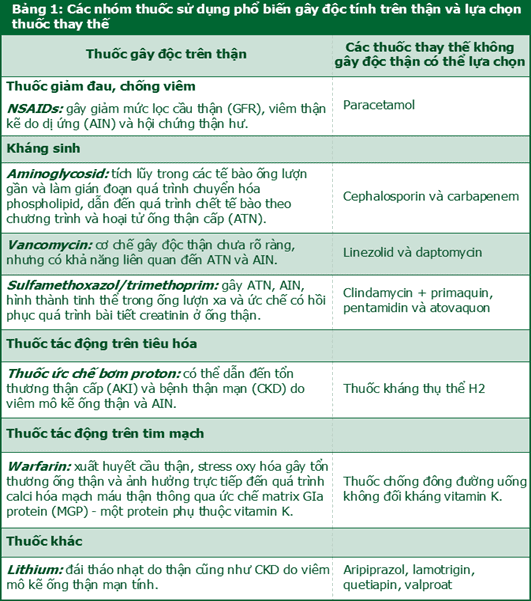 Bệnh nhân có BTM có thể nhạy cảm hơn với độc tính trên thận của thuốc. Thực tế, mỗi năm khoảng 18 - 20% bệnh nhân có BTM giai đoạn 3 - 5 được kê đơn ít nhất một thuốc có nguy cơ gây độc trên thận. Trong đó, ba nhóm thuốc phổ biến nhất bao gồm: thuốc chống viêm không steroid (NSAIDs), thuốc kháng virus và các dẫn chất bisphosphonat. Trong trường hợp lợi ích vượt trội nguy cơ, các thuốc gây độc tính trên thận có thể vẫn được chỉ định ở bệnh nhân có BTM. Tuy nhiên, nếu có thể, nhân viên y tế nên ưu tiên lựa chọn các thuốc khác thay thế không gây độc trên thận. Các nhóm thuốc thường sử dụng đã ghi nhận gây độc tính trên thận và các thuốc có khả năng thay thế không gây độc trên thận được liệt kê trong Bảng 1.