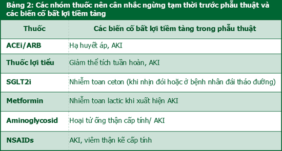 Cân nhắc ngừng một số loại thuốc (như metformin, ACEi, ARBs, và thuốc ức chế kênh đồng vận chuyển natri - glucose 2: SGLT2i) trong vòng 48-72 giờ trước khi phẫu thuật hoặc khi cần xử trí khẩn cấp các biến cố bất lợi của thuốc. Bảng 2 trình bày các nhóm thuốc nên cân nhắc ngừng tạm thời trước phẫu thuật và các biến cố bất lợi tiềm tàng liên quan đến việc tiếp tục sử dụng các thuốc này.