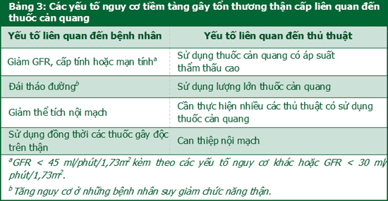 Việc sử dụng thuốc cản quang chứa iod liên quan tới nguy cơ AKI, với các tần suất báo cáo khác nhau phụ thuộc vào nhóm đối tượng, loại thuốc cản quang, đường dùng, liều dùng cũng như quy ước đánh giá độc tính trên thận. Mặc dù có nguy cơ AKI liên quan sử dụng thuốc cản quang ở bệnh nhân có BTM giai đoạn 4 - 5, nhưng việc trì hoãn hoặc thực hiện các phương pháp chẩn đoán hình ảnh không tối ưu do lo ngại về biến chứng liên quan đến thuốc cản quang ở bệnh nhân có giảm GFR cũng có thể gây hại cho bệnh nhân. Các yếu tố nguy cơ tiềm tàng gây tổn thương thận cấp liên quan đến thuốc cản quang được trình bày tại Bảng 3.